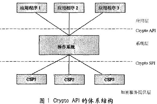 2.1智能卡與PC/SC規(guī)范 智能卡是一張內(nèi)含嵌入式集成電路芯片的信用卡般大小的塑料卡,具有儲存信息量大,數(shù)據(jù)保密性好,抗干擾能力強,儲存可靠,讀寫設(shè)備簡單,使用靈活,操作速度快,脫機工作能力強,易于攜帶等特點。本系統(tǒng)所使用的智能卡是一張?zhí)刂频膬?nèi)含有交換密鑰對,簽名密鑰對和證書用以提供加解密、認證等服務(wù)的電子卡。 PC/SC規(guī)范是一套為集成電路卡(ICC)與個人計算機系統(tǒng)設(shè)計進行交互的規(guī)范,能夠讓智能卡方便地訪問WindoW平臺。其主要優(yōu)點就是讓應(yīng)用程序不必為了與智能卡通信而去了解智能卡讀卡器的細節(jié),應(yīng)用程序通過PC/SC規(guī)范和智能卡讀卡器通信,后者再通過ISO7816與智能卡進行通信來獲取智能卡提供的服務(wù),其傳輸?shù)陌Y(jié)構(gòu)是TPDU。 1.2 Crypto API體系結(jié)構(gòu)與CSP Crypto API是微軟提供的一套公共接口,包含了一系列的函數(shù),為應(yīng)用程序提供加解密、數(shù)字簽名、哈希等安全服務(wù),而應(yīng)用程序不必關(guān)心其具體實現(xiàn)。不同的供應(yīng)商可以開發(fā)獨立的加密模塊,這些模塊成為加密服務(wù)提供者(Cryptographic Service Provider CSP),完成密鑰生成/交換、加解密、數(shù)字簽名、認證等服務(wù)的真正模塊。微軟默認的CSP是RSA Based Provider,使用RSA公司的加密算法。一個系統(tǒng)中可以加載多個CSP模塊,它們相互獨立。應(yīng)用程序可以使用任意一個CSP模塊,而不必關(guān)心它的具體實現(xiàn),每個CSP都對Crypto API進行不同的實現(xiàn)。 Crypto API的體系結(jié)構(gòu)如圖1所示。